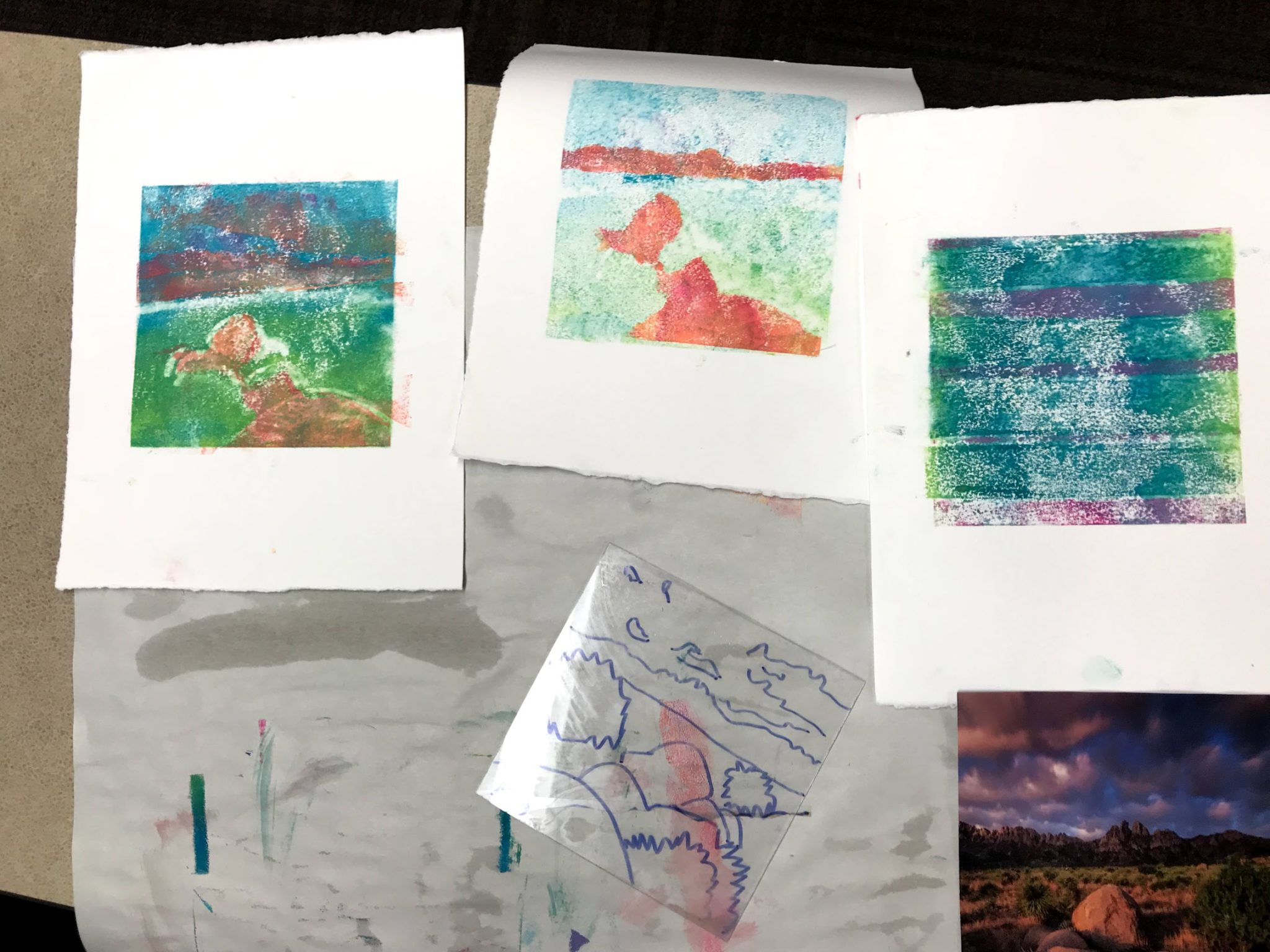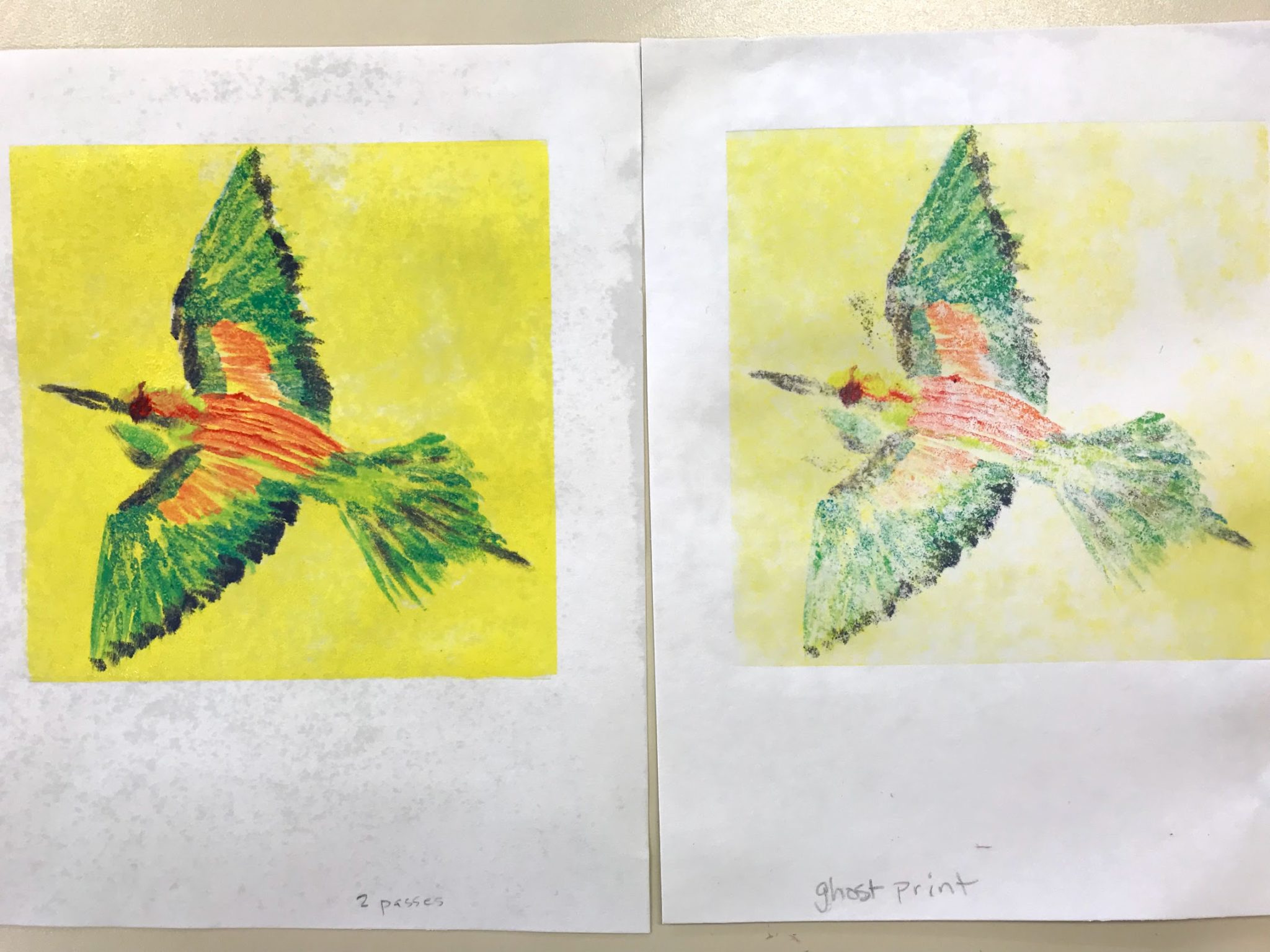 Artists used plexiglass plates to trace an original image. Next, they used various techniques to apply ink and prepare their plates for printing. As each image was transferred to paper, artists were encouraged to also make a ghost print or second copy from the plate producing a lighter version of the original. Artists then repeated this process of inking and printing plates in various iterations as the workshop progressed producing related but distinct prints. Jessica uses this technique with students to help them test and discover the results of various printing techniques. This process, which is easily repeatable, also helps students to gain greater practice with printmaking skills than they might gain with other printing styles. Its improvisational nature frees artists to test new ideas without expectations of a precise outcome.